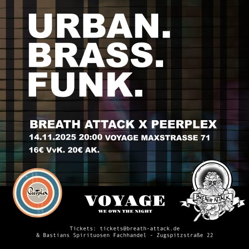 Tanzt mit uns durch die Nacht mit groovy Funk & Soul von Peerplex und Urban Brass Beats von Breath Attack. On top gibts unsere Album-Release und Aftershow-Party mit den DJs vom Voyage-Club in der Maxstraße. Get your Tickets now!